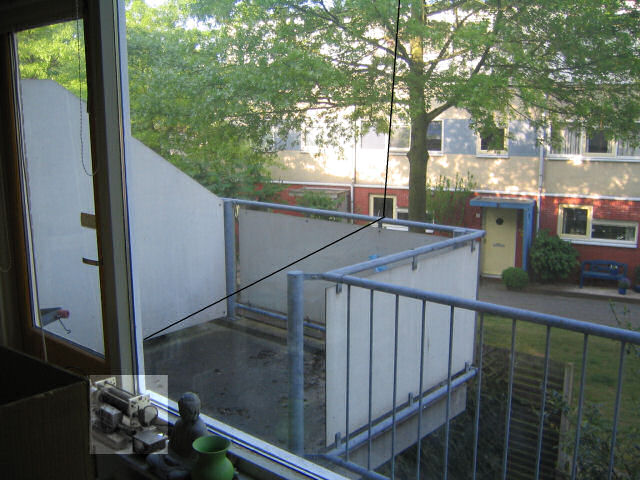 Uiteindelijk viel het besluit op een redelijk kort stuk draad van mijn slaapkamerraam boven, naar het hek van mijn balkon (zie foto). Met de optie voor die andere, waarschijnlijk wat betere antennes voor de wat langere termijn nog niet helemaal uitgesloten. Het zwarte draad dat ik gebruik is slechts met de grootste moeite van buitenaf zichtbaar. In tegenstelling tot wat mensen vaak denken moet je het draad bij dit soort constructies niet te strak blijven aanspannen. Een kennis van mij haalde dit recentelijk nog eens aan. Op die manier verzwak je namelijk iedere keer het draad, dat toch steeds verder oprekt. Beter is om het een klein beetje te laten spelen in de wind. Niet teveel natuurlijk, want dan komt de aanpassing van de zender weer in gevaar. Om het draadje op de zender aan te kunnen sluiten gaat het van het balkonhek tussen de balkondeur geklemd naar binnen, waar het via een in de vensterbank opgestelde antennetuner op de juiste frequentie wordt gebracht en op de zender/ontvanger wordt aangepast. De lengte van de draad op zichzelf is heel goed, het verticale deel is 6 à 7 meter (de optimale lengte voor de 30 m band is 7,5 meter), maar het horizontale deel van tweeënhalve meter binnen de hoogte van het balkonhek verknoeit het vermoedelijk weer voor een deel. De effectiviteit van de antenne is bovenaan het kleinst, en neemt toe naarmate je meer naar beneden komt. Bij 7,5 meter is dit optimaal. In het horizontale deel gaat het effectieve deel nog een tijdje door, waardoor vermoedelijk de helft van het zendvermogen niet tot zijn recht komt, omdat dit horizontale deel door het (geaarde) balkonhek nauwelijks de kans krijgt om het signaal te verspreiden. Een oplossing zou zijn om het horizontale stuk te laten vervallen en de antennetuner op het uitende van de antenne op het balkonhek aan te sluiten, maar die is met al dat verzilverde draad, en opgebouwd op een houten plankje nou niet bepaald weersbestendig. (wordt vervolgd)